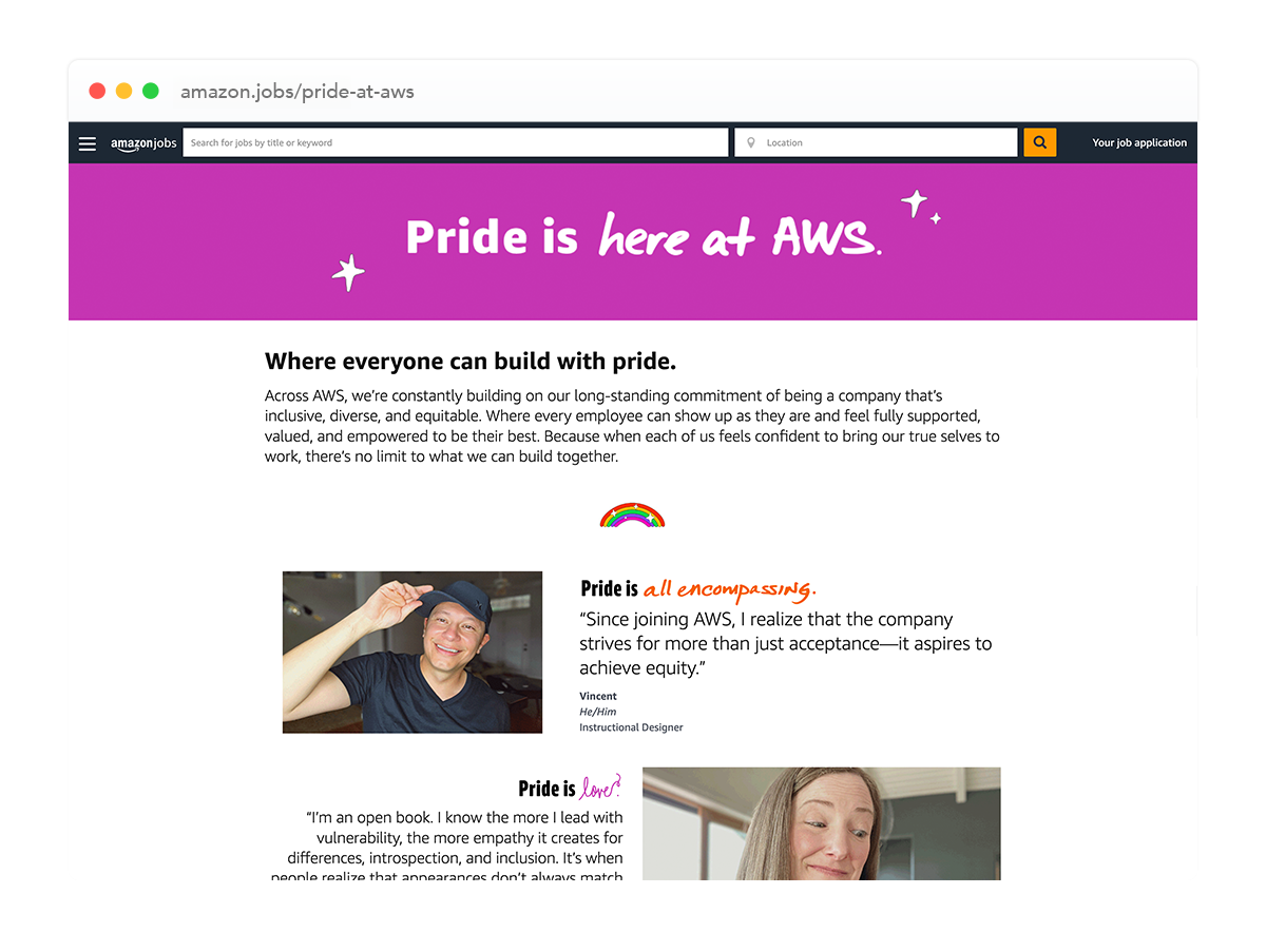 But it wasn't just about storytelling. The page also showed how Amazon was actively showing up for the LGBTQ+ community with real proof points: advocating for the Equality Act, supporting LGBTQ+ rights legislation at the federal and state level, building inclusive benefits, connecting employees with affinity groups across 50+ chapters worldwide, and funding LGBTQ+ nonprofits and organizations around the globe. It grounded the personal stories in something bigger, showing that the culture these employees were describing wasn't just words. The stories made it personal. The proof points made it real.